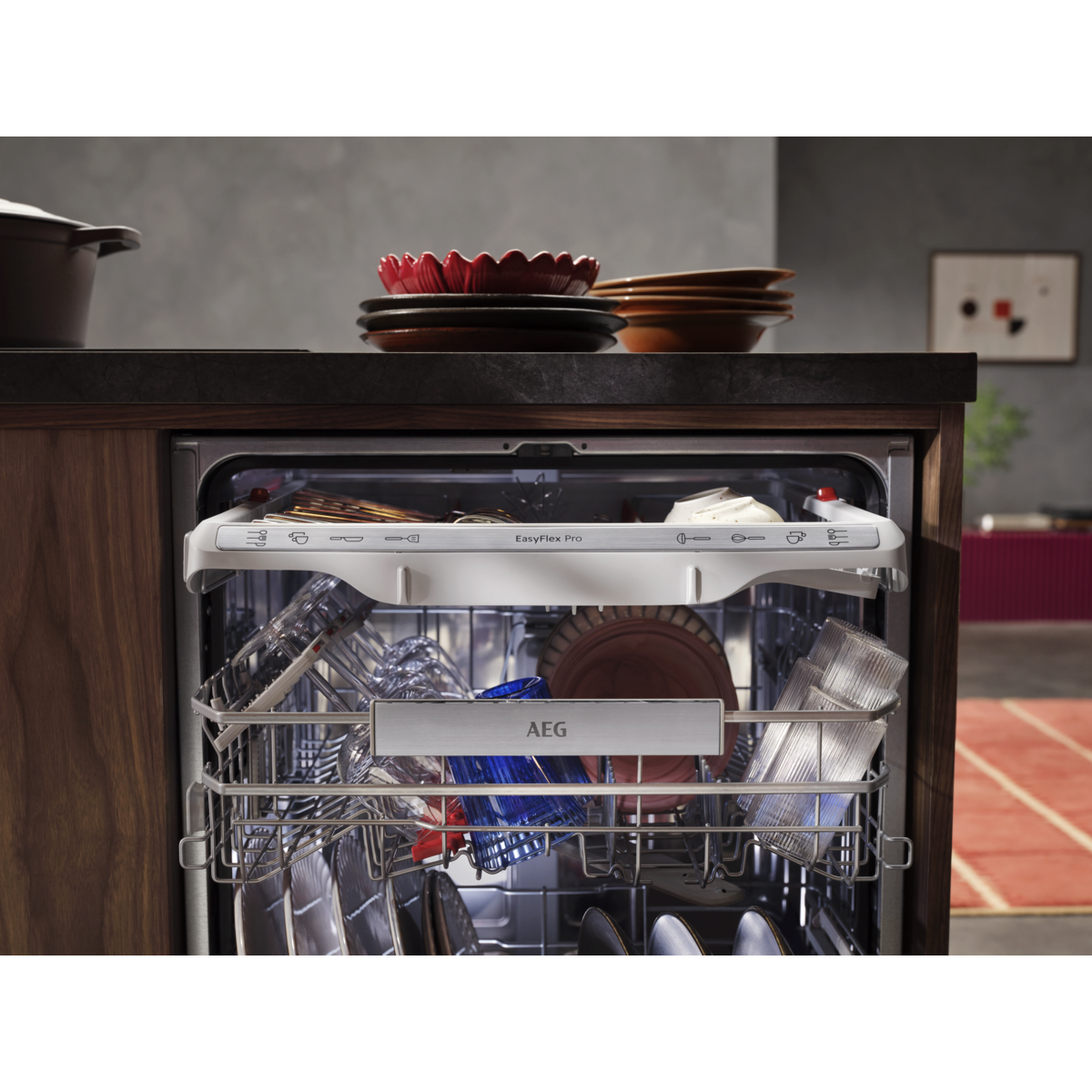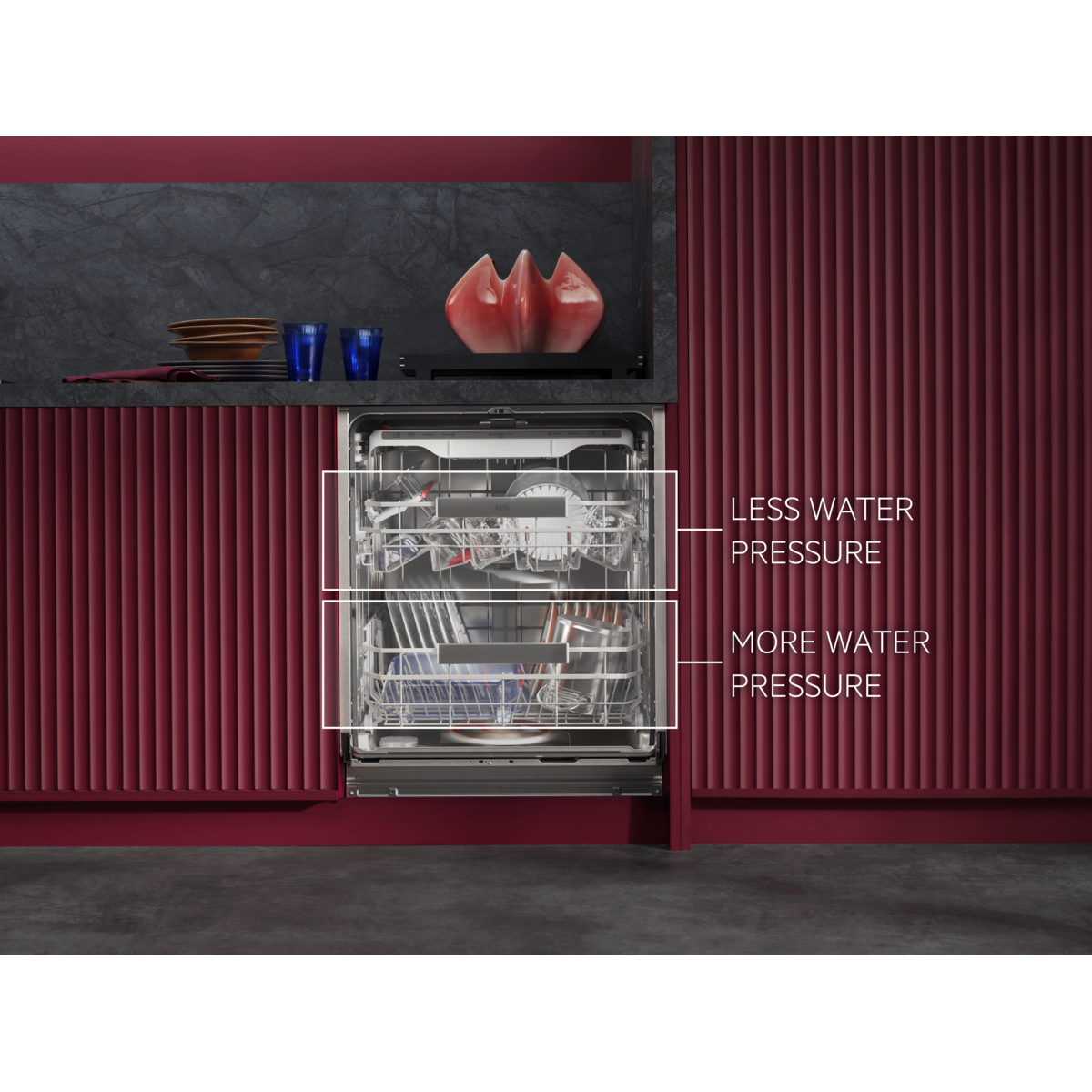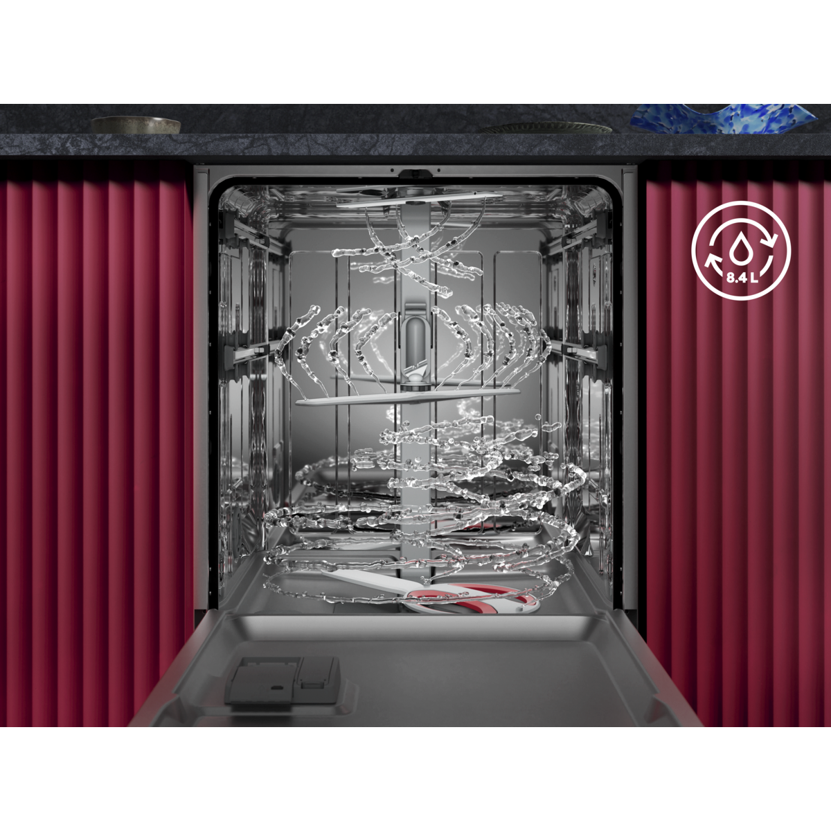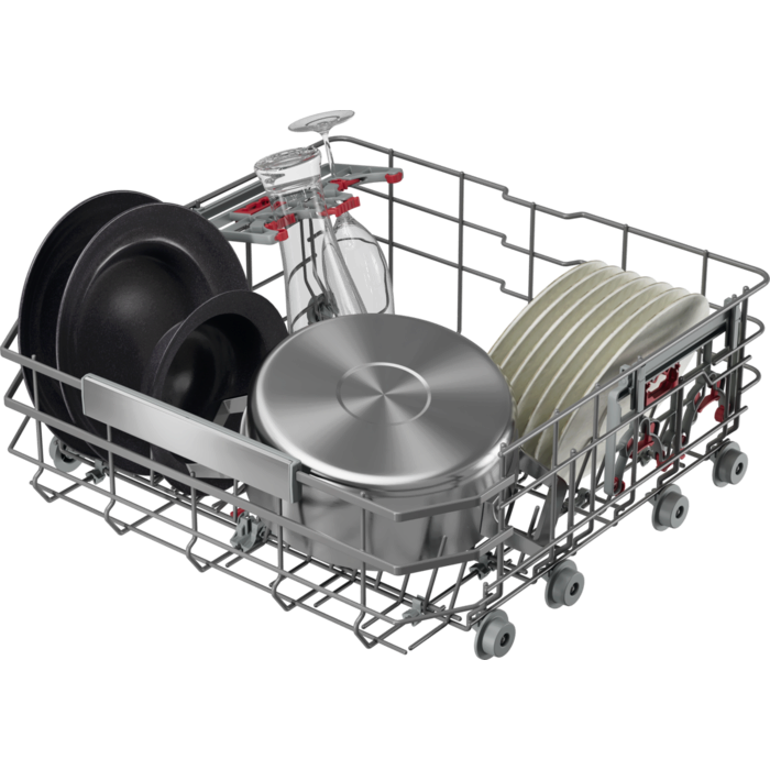 Serija 9000: Višenamjenske, klizne košare i ladica za pribor. Držači za sigurno držanje čaša i pladnjeva. Snažno pranje uklanja stvrdnute ili osušene ostatke hrane. Visoko učinkoviti sustav upotrebljava tek 8,4 l vode.